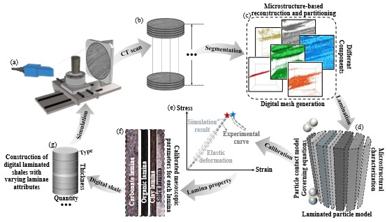 Abstract:Sedimentary rocks with well-developed laminated structures, such as shales, exhibit intricate mechanical responses driven by the variability and heterogeneity of lamina attributes. Quantifying the influence of individual lamina attributes on rock mechanical responses is essential for understanding the complex deformation and failure mechanisms of laminated shales, with broad implications for geo-applications across Earth sciences and energy fields. However, precisely decoupling lamina-related variables in rock experiments is challenging. We develop a digital rock workflow that reconstructs internal fabric and lamina characteristics by integrating CT-derived shale microstructures with a discrete element method-based laminated particle model, with contact parameters for each lamina type calibrated using experimental data. Simulation results show that increasing soft laminae (clay) quantity reduces strength by 15 % and modulus by 35 %, while greater thickness lowers strength by 35 % and halves the modulus, both raising Poisson's ratio. Conversely, shales interspersed with stiff laminae (silica) exhibit the opposite variation. Variations in lamina properties significantly affect microcracking behavior during failure, complicating the damage mode. Increased lamina quantity and thickness amplify the complexity of microcrack evolution, with soft laminae playing a dominant role by facilitating shear slip and promoting shear failure. Analysis of internal stress characteristics within soft and stiff laminae, boundary regions, and the rock matrix reveals that these mechanical variations in laminated shale stem from stress mismatches across these structural components. The greater the disparity, the stronger the mechanical contrast, amplifying localized deformation and failure complexity. Our simulations align well with experimental data, highlighting the potential of digital shale modeling to quantitatively link rock mechanical properties with lamina attributes while providing a crucial micro-mechanical perspective.