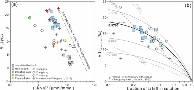Lithium (Li) isotopes have been extensively studied as a key proxy for silicate weathering. However, our understanding of Li isotope fractionation in lowlands and/or floodplains, particularly regarding authigenic phases, needs further refinement. In this study, we present comprehensive geochemical data, including elemental, ionic concentrations, as well as lithium and strontium (Sr) isotopic compositions, obtained from river water, suspended particulate matter (SPM), and associated oxyhydroxide fractions collected across the mid-lower Changjiang basin. The dissolved δ7Li values (+8.4‰ to +17.1‰) contrast with suspended particulate matter (SPM: −2.7‰ to −0.3‰) and its oxyhydroxide fraction (−15.9‰ to −7.0‰), revealing significant isotope fractionation during secondary phase formation. An inverse mixing model identifies silicate weathering (50.5 ± 4.9%) and evaporite dissolution (35.4 ± 4.0%) as the dominant sources of the dissolved Li, followed by urban sewage contributions of 10.4 ± 1.5%. After correcting for non-silicate sources, dissolved δ7Li values conform to a steady-state batch fractionation model, reflecting the dynamic balance between primary mineral dissolution and secondary mineral (mainly clays) formation. The nearly consistent 87Sr/86Sr ratios of SPM oxyhydroxide fraction with those of river water strongly demonstrate their authigenic precipitation within the riverine environment. We further infer that the formation of authigenic oxyhydroxide likely played a significant role in fractionating Li isotope in the geological past, albeit secondary to clays. However, in the context of intense dam constructions, their impacts cannot be easily observed in modern river lowlands/floodplains due to reduced SPM concentrations. According to the updated global average, we hypothesize that floodplains exert little influence on elevating riverine δ7Li values, at least in present-day river basins surrounding the Tibetan Plateau. These findings refine our understanding of river chemistry in a highly-populated river basin, highlighting authigenic processes as a potential control on Li isotopes, warranting re-evaluation in high erosion and free-flowing river systems.