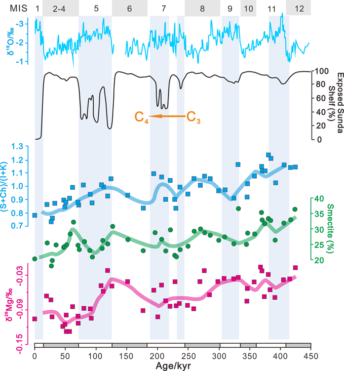 Abstract :The Mid‐Brunhes Event (MBE, ∼430 ka) represents a pivotal climatic transition in the late Pleistocene, while monsoon‐driven impacts on low‐latitude regions during this interval remain debated. Sediments archived in the MD05‐2901 gravity core from the South China Sea (SCS) record the influence of the East Asian summer monsoon (EASM) on regional climate dynamics. In this study, we employ major and trace element systematics and magnesium isotope analyses (δ26Mg) of clay‐sized (<2 μm) sediments to reconstruct EASM variability, offering a novel perspective on its evolution over the past 430 ka. Upper Continental Crust normalized rare earth element and major elemental depletion patterns are consistent with established sequences of elemental mobility during silicate weathering, thus these sediments are produced by silicate weathering. A temporal decline in δ26Mg values is observed, correlating with reduced smectite and chlorite proportions in the total mineral assemblage. This coupled trend deviates from expectations for silicate weathering sequences, necessitating a re‐evaluation of sediment provenance. Provenance analysis demonstrates that smectite and chlorite predominantly derive from mafic rock weathering in the southern SCS. We propose that the observed mineralogic and isotopic shifts reflect a temporal decrease of highly weathered siliciclastic materials from southern provenances presumably related to a weakened clockwise oceanic circulation system, which is a coupled response to the long‐term weakening of EASM and intermittent inundation of the Sunda Shelf over the past 430 Ka. Our results underscore the interconnected marine‐terrestrial climatic feedbacks modulating tropical monsoon systems on orbital timescales.