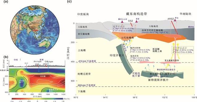 Abstract: The Tibet peaked due to the incorporation of slab materials and intensive mantle-crust interaction. It remains uncertain regarding the differentiated mantle enrichment and elemental cycling process in a post-collisional setting. Here, we use stable Mg-K isotopic data from young (< 5 Ma) arc-type and OIB-type basalts-spatially and genetically linked to slab subduction and stagnation-to quantify the origin, proportion, and transport mechanism of materials contributing to mantle heterogeneity. Both basaltic types from southeast Tibet possess homogeneous and low δ26Mg values (-0.39 ± 0.03‰ to -0.36 ± 0.04‰) compared to the normal mantle range (δ26Mg = -0.25 ± 0.04‰); Mg-Sr-Nd-Pb isotopic mixing models suggest that isotopically light marine carbonates were incorporated into the mantle wedge and mantle transition zone (MTZ). In terms of the isotopic dataset of post-collisional magmatic rocks, pervasive carbonatitic metasomatism served as the deep carbon source that enhanced mantle heterogeneity. Compared to the mantle-like δ41K (-0.49 ± 0.04‰ to -0.35 ± 0.02‰) of arc-type samples that re-homogenized in the wedge, the OIB-type lavas have variable δ41K values (-0.73 ± 0.03‰ to -0.54 ± 0.02‰) lower than those of primitive mantle (δ41K = -0.42 ± 0.08‰), suggesting an increased release of isotopically light K from dehydrated Neo-Tethyan slab residues that stagnated in the MTZ. Geophysical evidence supports that these deep-seated metasomatic agents triggered wet upwelling flows atop the MTZ and transported surficial materials back via volcanism. Critically, this study constrains the origin of mantle heterogeneity and material circulation triggered by various contributions of the subducted plate.